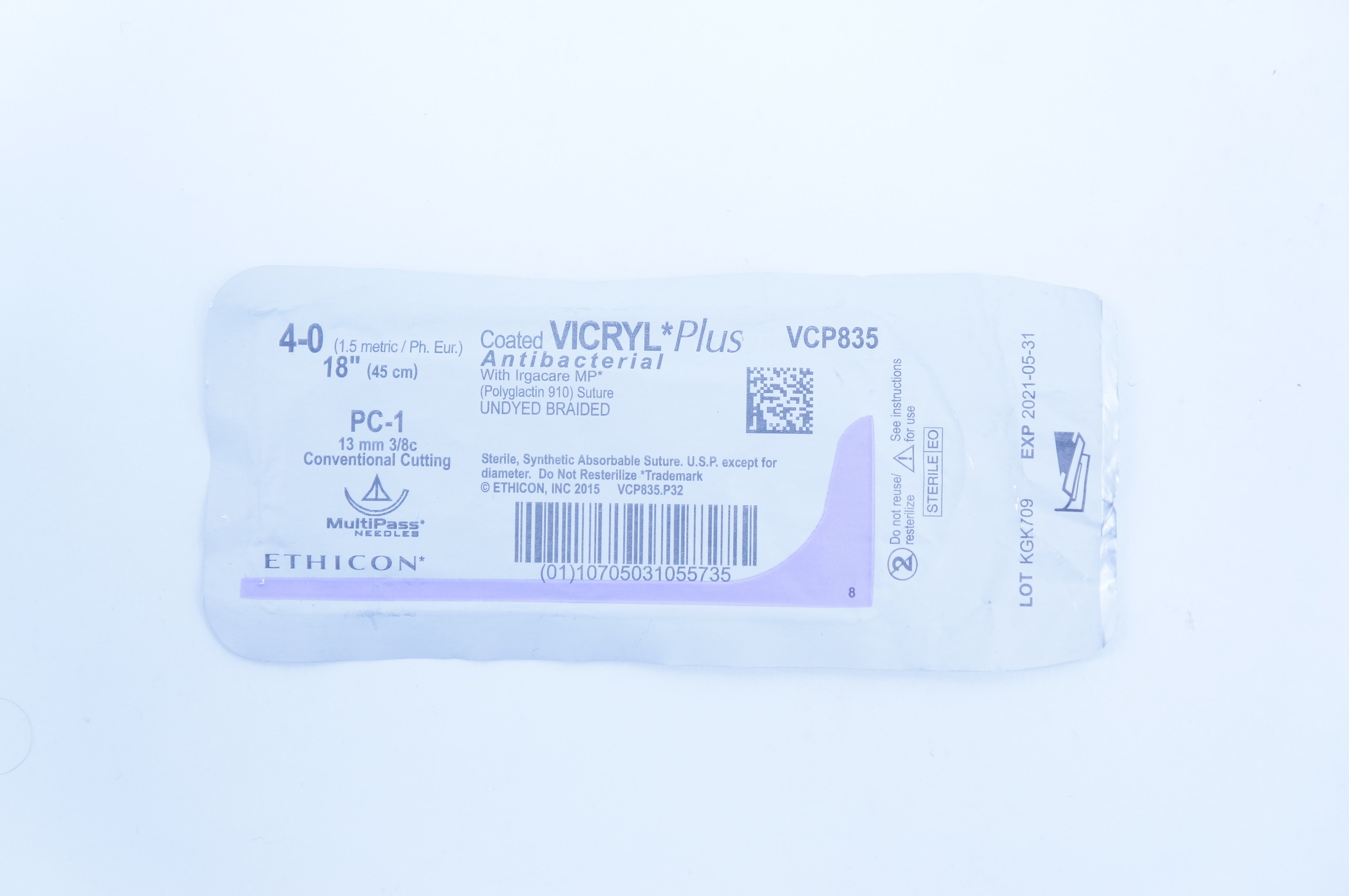 Ethicon VCP835 Coated Antibacterial with Irgacare MP, Vicryl Plus Polyglactin 910 Suture Undyed Braided