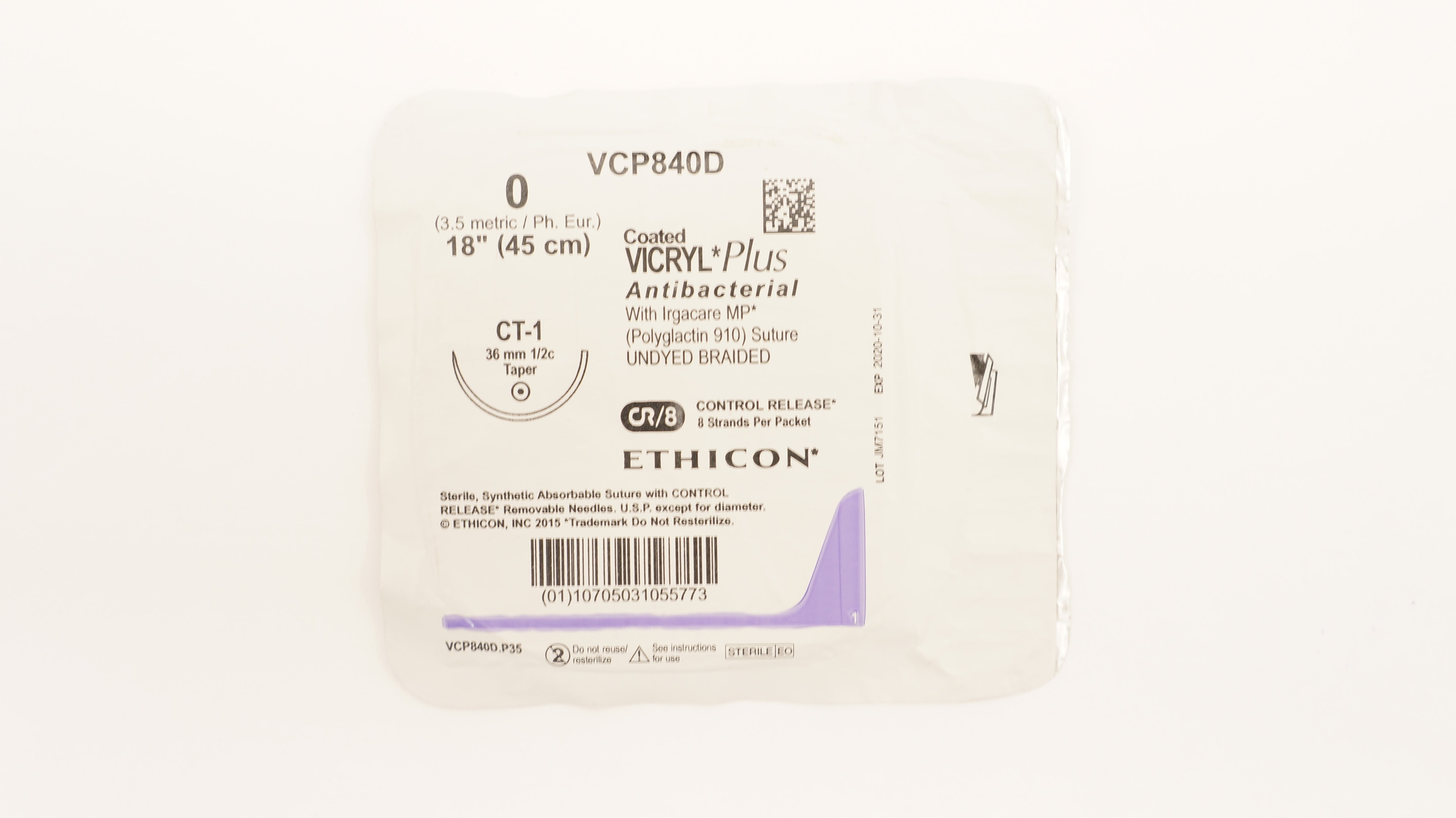 - Ethicon VCP840D 0 Coated Vicryl Plus Stre CT-1 36mm 1/2c Taper, 18inch (x)