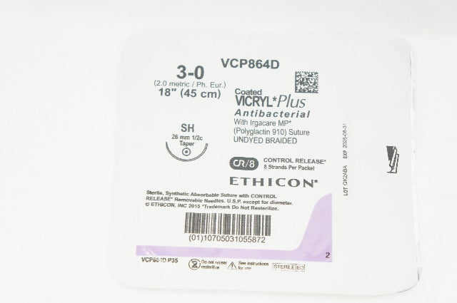 - Ethicon VCP864D 3-0 Coated Vicryl Plus Polyglactin Stre SH 26mm 1/2cTaper 18inch