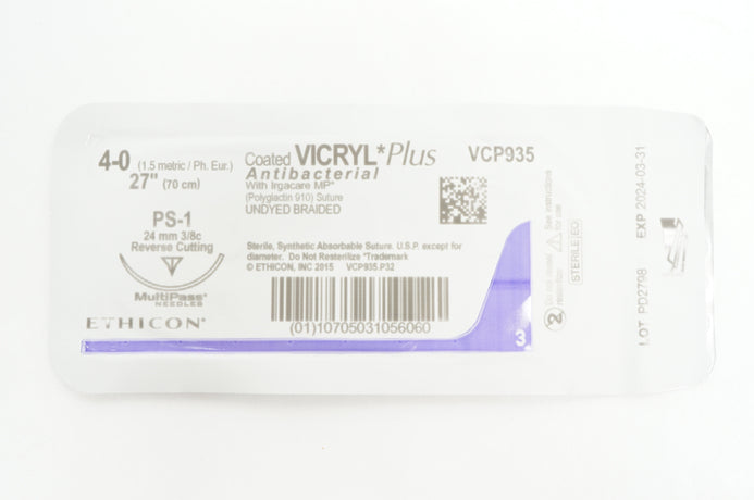- Ethicon VCP935 4-0 Vicryl Plus Stre PS-1 24mm 3/8c Reverse Cutting 27in