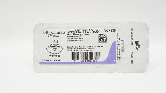 - Ethicon VCP935 4-0 Vicryl Plus Stre PS-1 24mm 3/8c Reverse Cutting 27in (x)