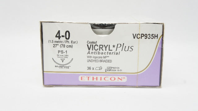 - Ethicon VCP935H 4-0 Coated Vicryl Plus PS-1 24mm 3/8c, 27in. - Box of 36