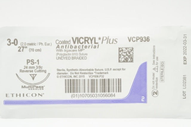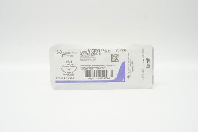 - Ethicon VCP936 3-0 Vicryl Plus, PS-1, 24mm 3/8c Reverse Cutting, 27inch (x)