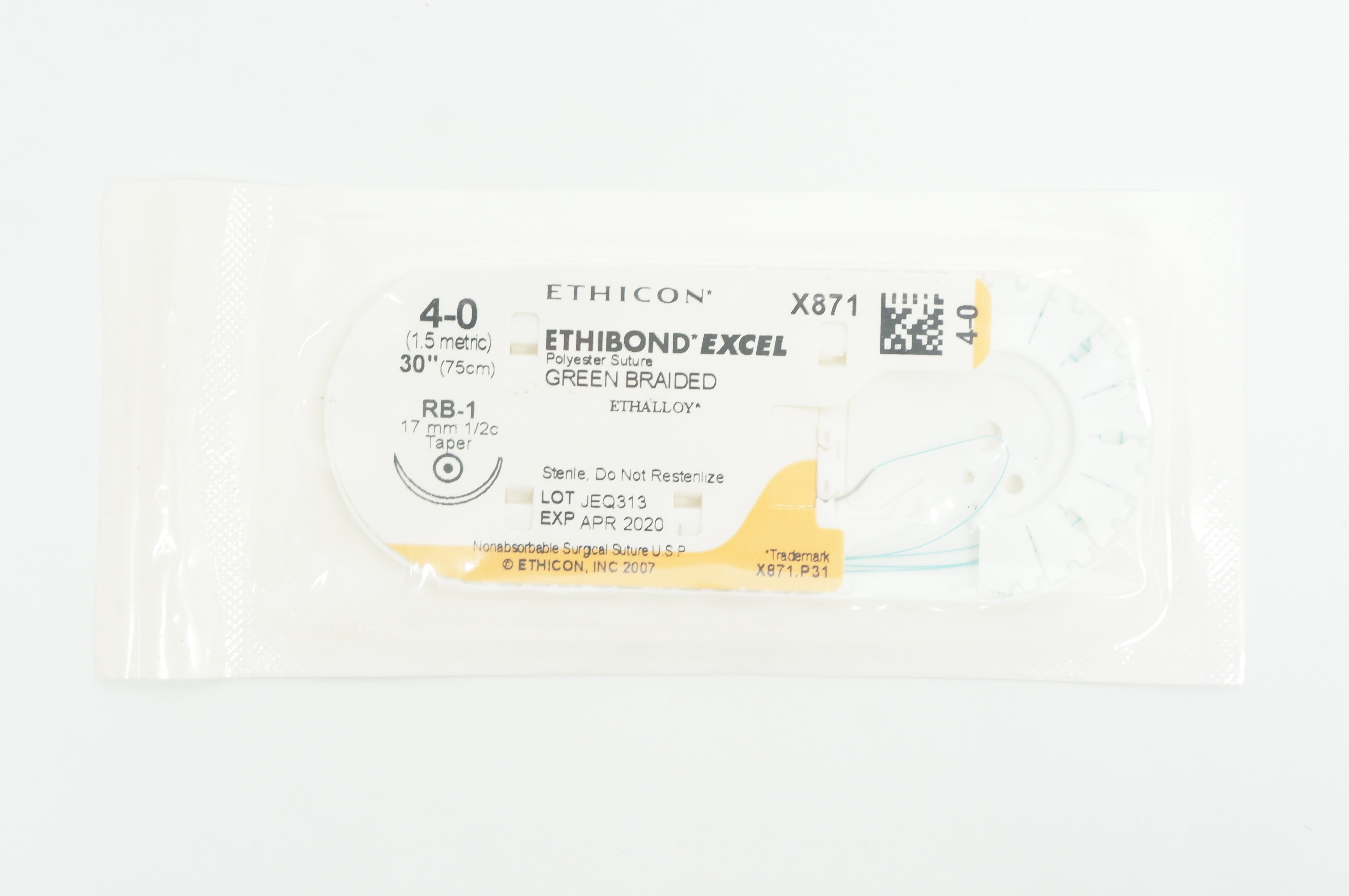 Ethicon X871 4-0 ETHIBOND EXCEL, RB-1, 17mm 1/2c Taper, 30inch (x)
