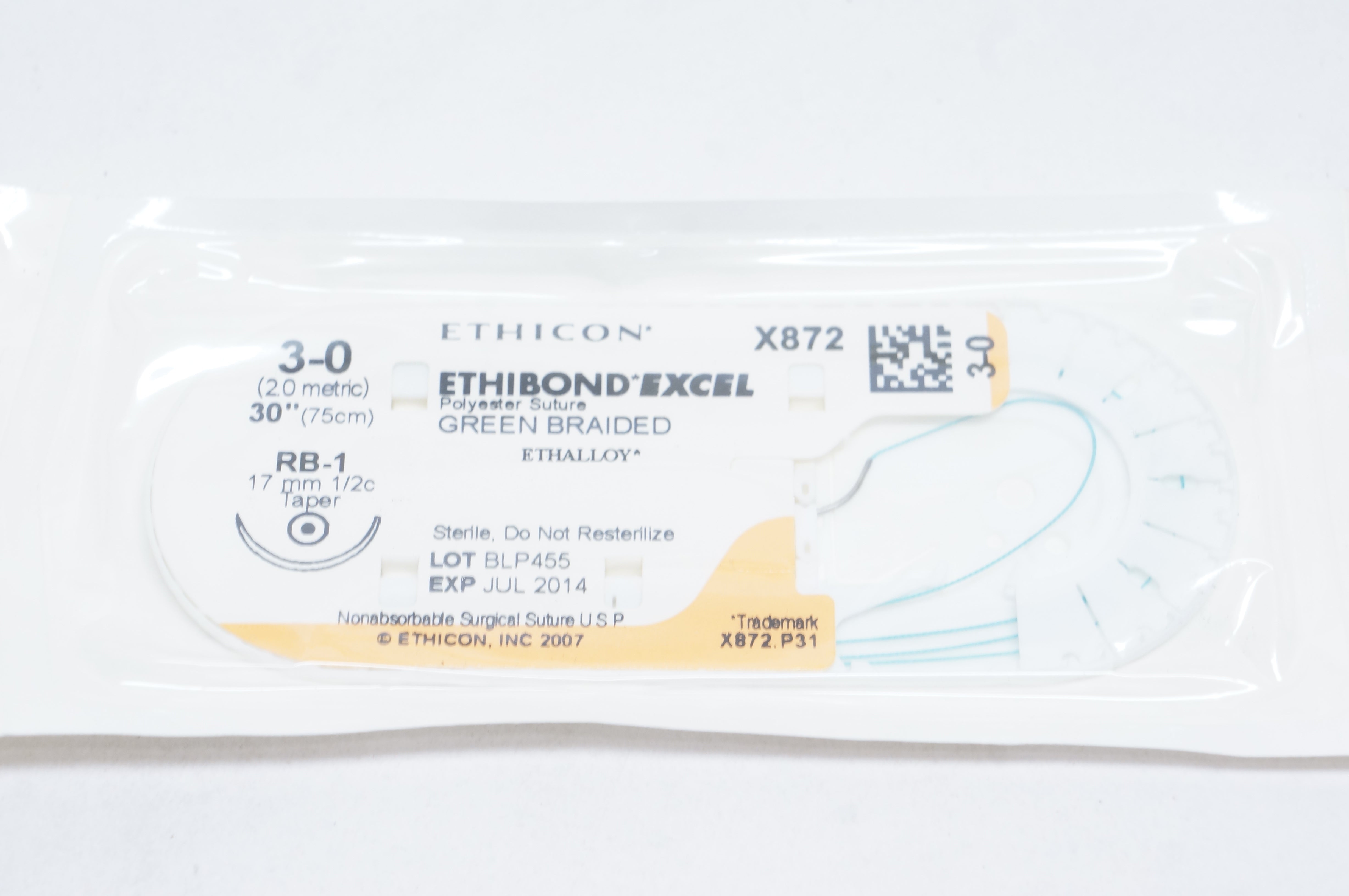 - Ethicon X872 3-0 ETHIBOND EXCEL, RB-1, 17mm 1/2c Taper, 30inch (x)