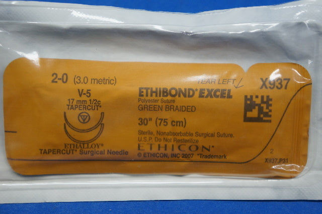 Ethicon X937 2-0 ETHIBOND EXCEL, V-5 17mm 1/2c TAPERCUT, Green Braided, 30inch