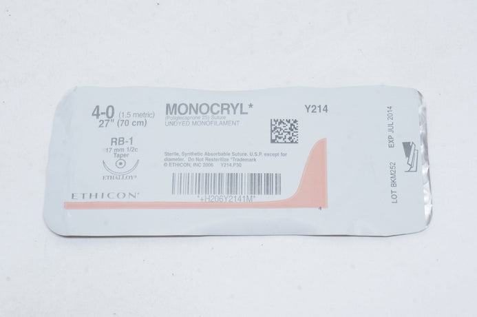Ethicon Y214 4-0 MONOCRYL, RB-1, 17mm 1/2c Taper, 27inch