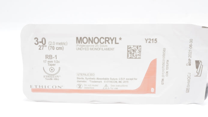 Ethicon Y215 3-0 MONOCRYL Poliglecaprone Stre RB-1 17mm 1/2c Taper, 27inch