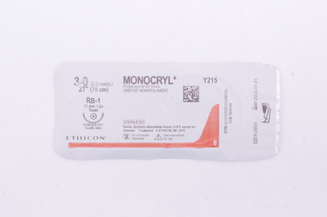 - Ethicon Y215 3-0 MONOCRYL Stre RB-1 17mm 1/2c Taper 27 inch