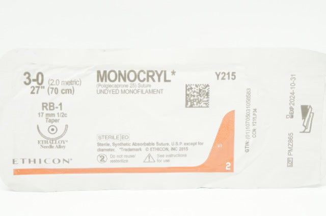 - Ethicon Y215 3-0 MONOCRYL Undyed Monofilament RB-1 17mm 1/2c Taper, 27 inch
