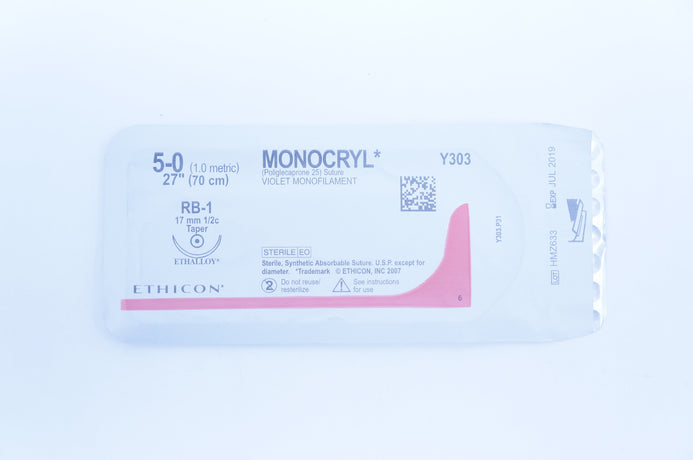 Ethicon Y303 5-0 Monocryl (Poliglecaprone 25) Suture Violet Monofilament RB-1 17 mm 1/2c Taper Ethalloy 27 inch