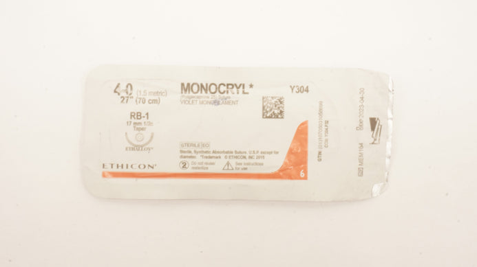 Ethicon Y304 4-0 Monocryl Violet Monofilament, RB-1 17mm 1/2c Taper, 27inch
