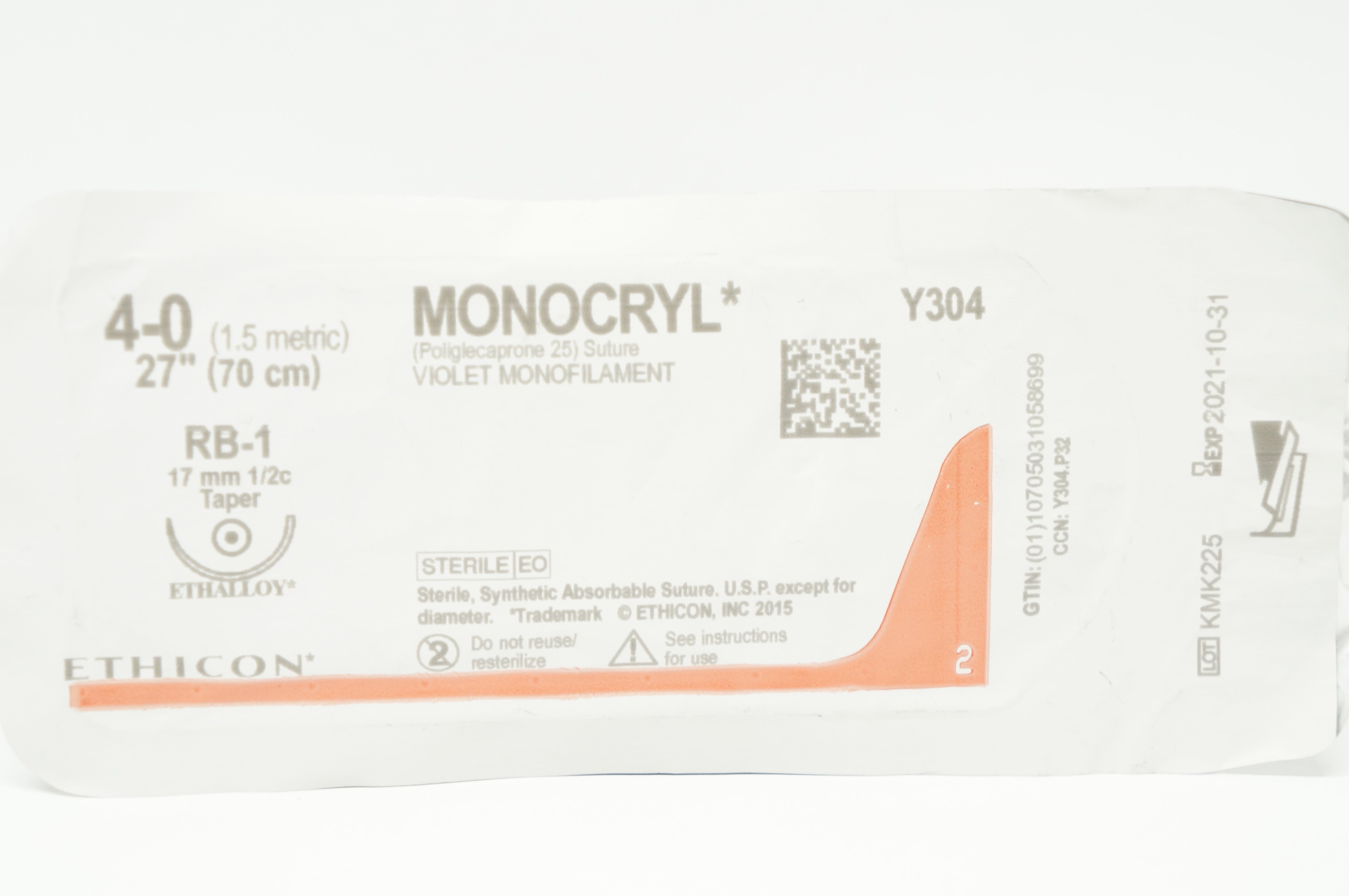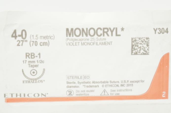 Ethicon Y304 4-0 MONOCRYL Violet Monofilament RB-1 17mm 1/2c Taper, 27inch (x)