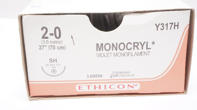 Ethicon Y317H 2-0 Monocryl SH 26mm 1/2c Taper 27inch - Box of 16 (x)