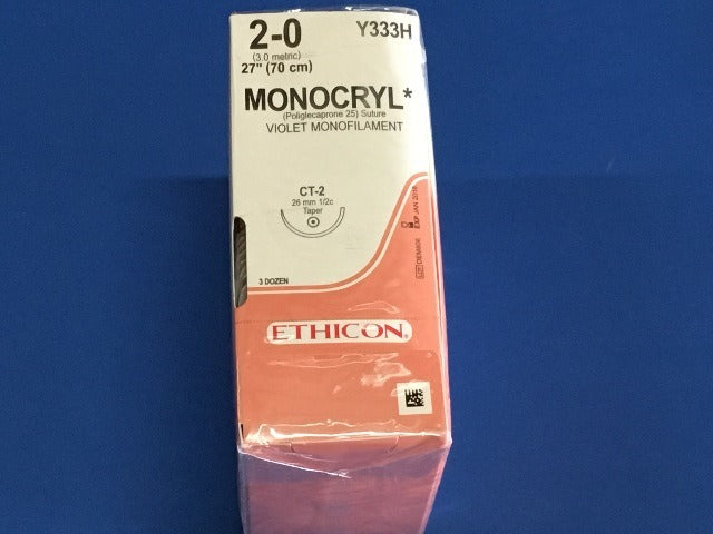 Ethicon Y333H MONOCRYL, Taper Point, Absorbable, CT-2 26mm ½ Circle, Violet Monofilament 27" 70cm, Size: 2-0