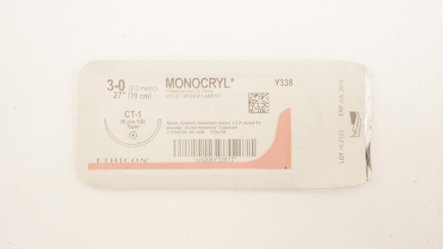 Ethicon Y338 3-0 MONOCRYL Poliglecaprone 25 Suture Violet Monofilament CT-1, 36mm 1/2c Taper, 27inch
