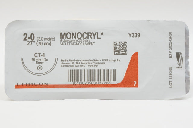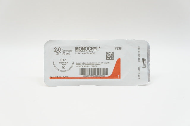 Ethicon Y339 2-0 MONOCRYL, CT-1, 36mm 1/2c Taper, 27inch