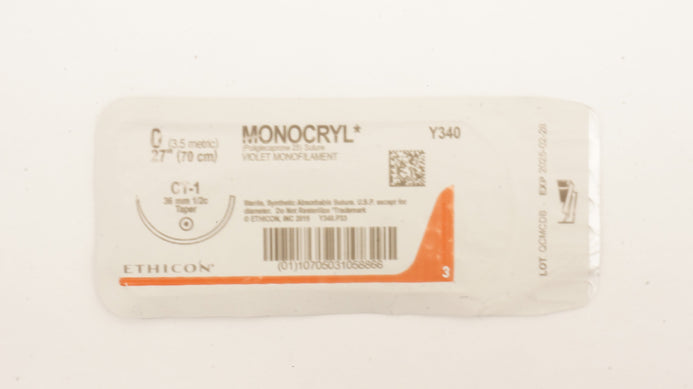 Ethicon Y340 0 MONOCRYL Poliglecaprone 25 Suture Violet Monofilament CT-1 36mm 1/2c Taper, 27 inch