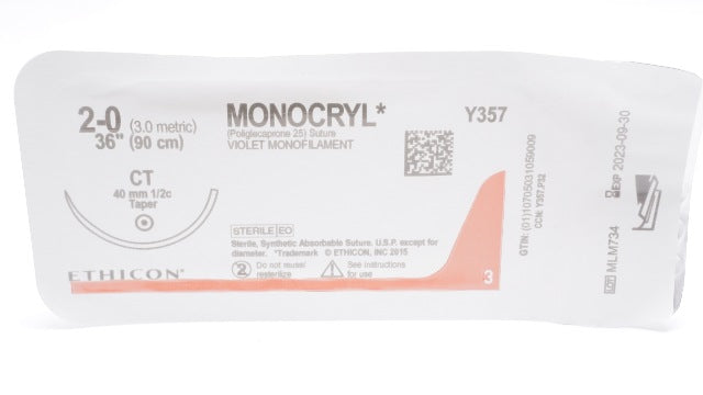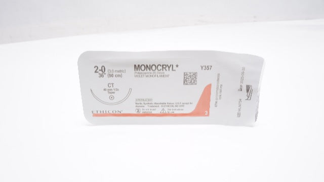 Ethicon Y357 2-0 Monocryl Poliglecaprone Stre CT 40 mm 1/2c Taper 36inch (x)