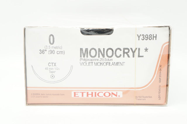 Ethicon Y398H 0 Monocryl Stre CTX 48mm 1/2c Taper 36inch - Box of 36