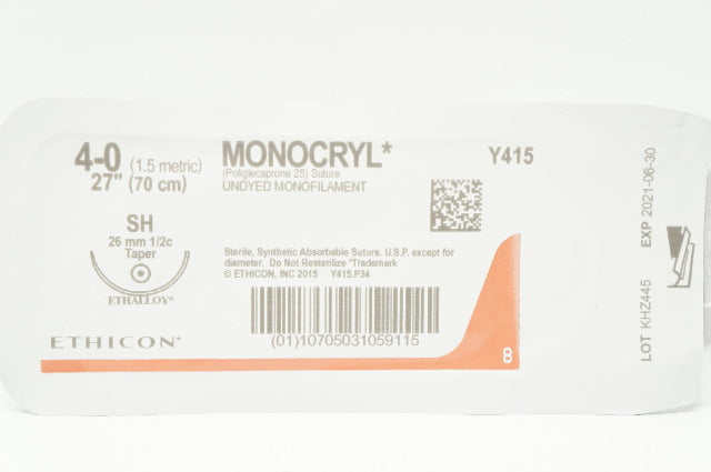 - Ethicon Y415 4-0 MONOCRYL, SH, 26mm 1/2c Taper, 27inch (x)