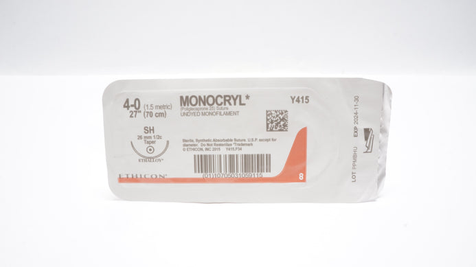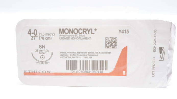 - Ethicon Y415 4-0 MONOCRYL Undyed Monofilament Stre SH 26mm 1/2c Taper, 27inch