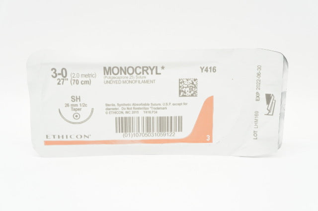 - Ethicon Y416 3-0 Monocryl Poliglecaprone 25 Stre SH 26mm 1/2c Taper, 27 inch (x)