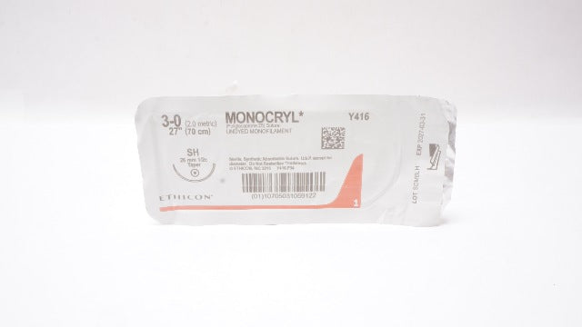 - Ethicon Y416 3-0 Monocryl Stre Undyed Monofilament SH 26mm 1/2c Taper, 27 inch