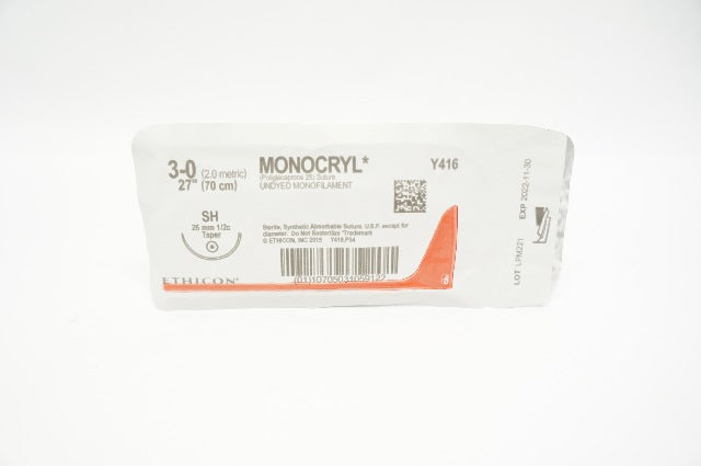 - Ethicon Y416 3-0 Monocryl Undyed Monofilament SH 26mm 1/2c Taper, 27 inch (x)