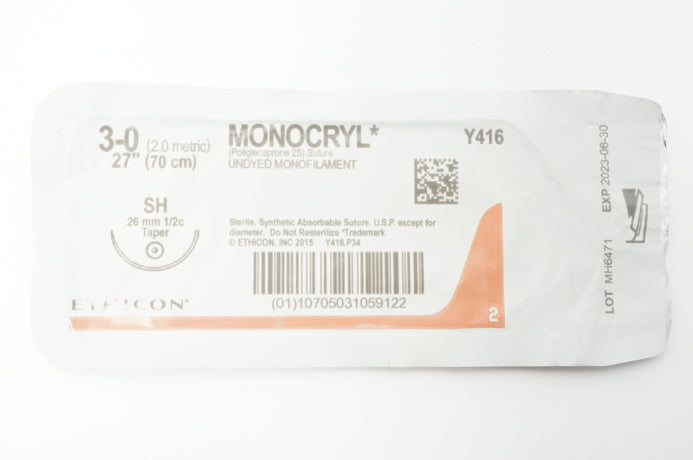 - Ethicon Y416 3-0 MONOCRYL Undyed Monofilament SH 26mm 1/2c Taper, 27inch (x)