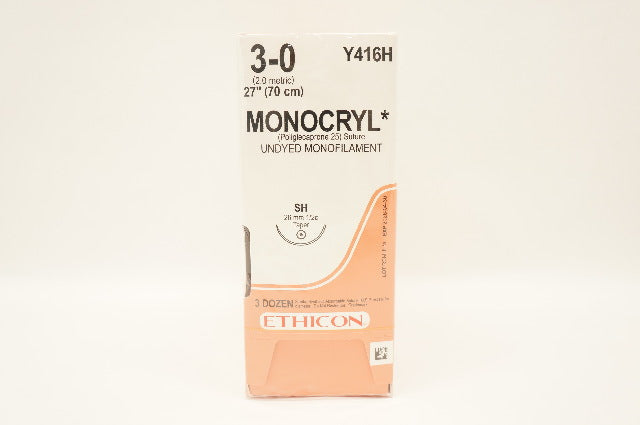 Ethicon Y416H 3-0 MONOCRYL, SH 26mm 1/2 Circle, 27inch - Box of 36