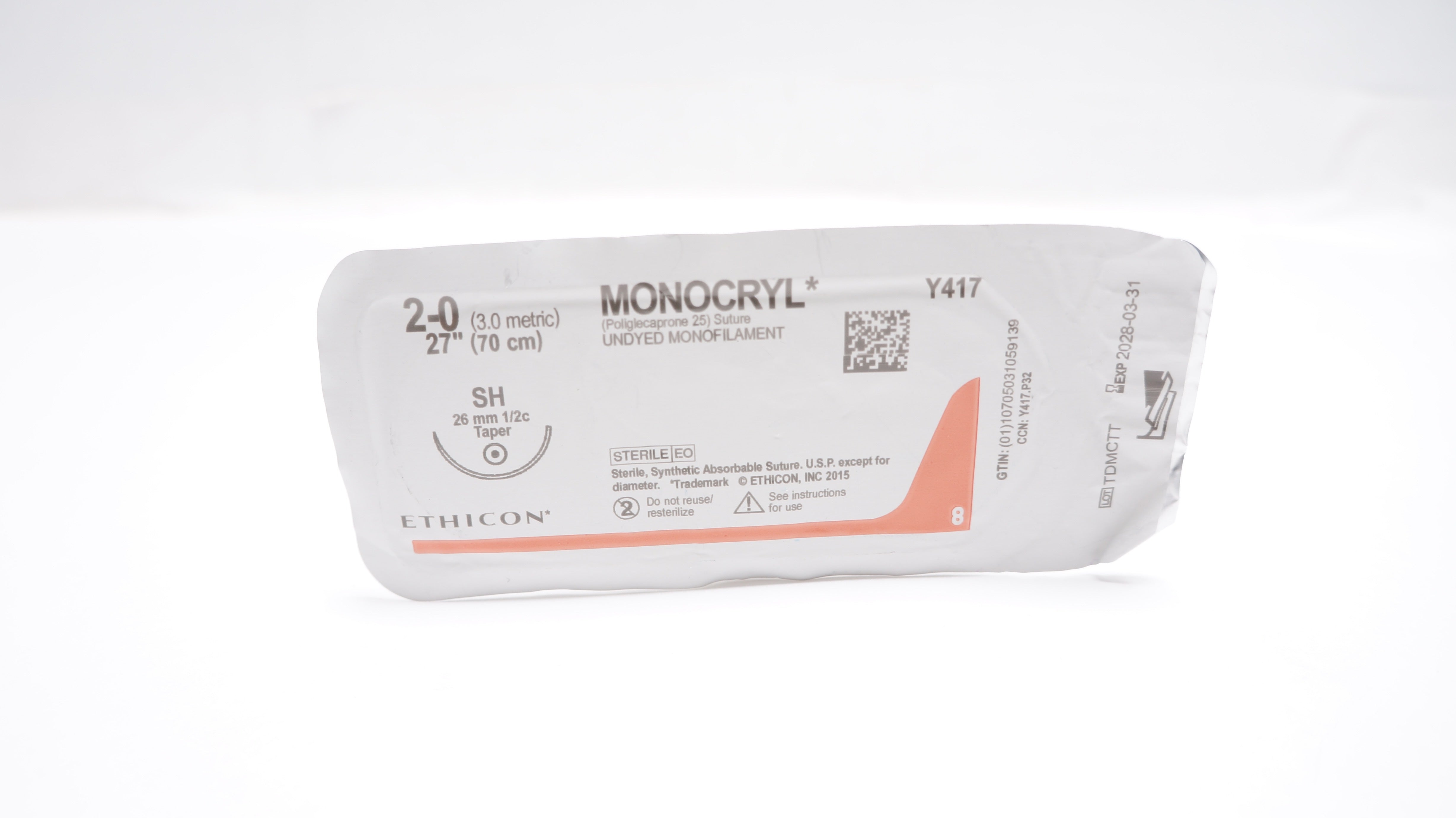 Ethicon Y417 2-0 Monocryl Poliglecaprone 25 Suture Undyed Monofilament SH 26mm 1/2c Taper 27 inch