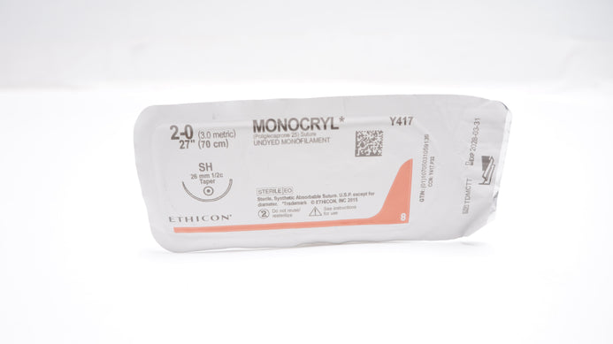 Ethicon Y417 2-0 Monocryl Poliglecaprone 25 Stre SH 26mm 1/2c Taper 27 inch