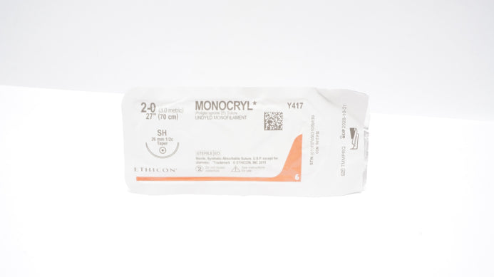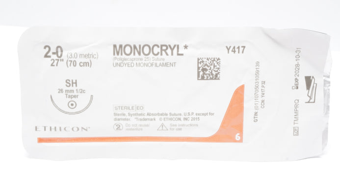 - Ethicon Y417 2-0 Monocryl Poliglecaprone 25 Stre SH 26mm 1/2c Taper 27 inch