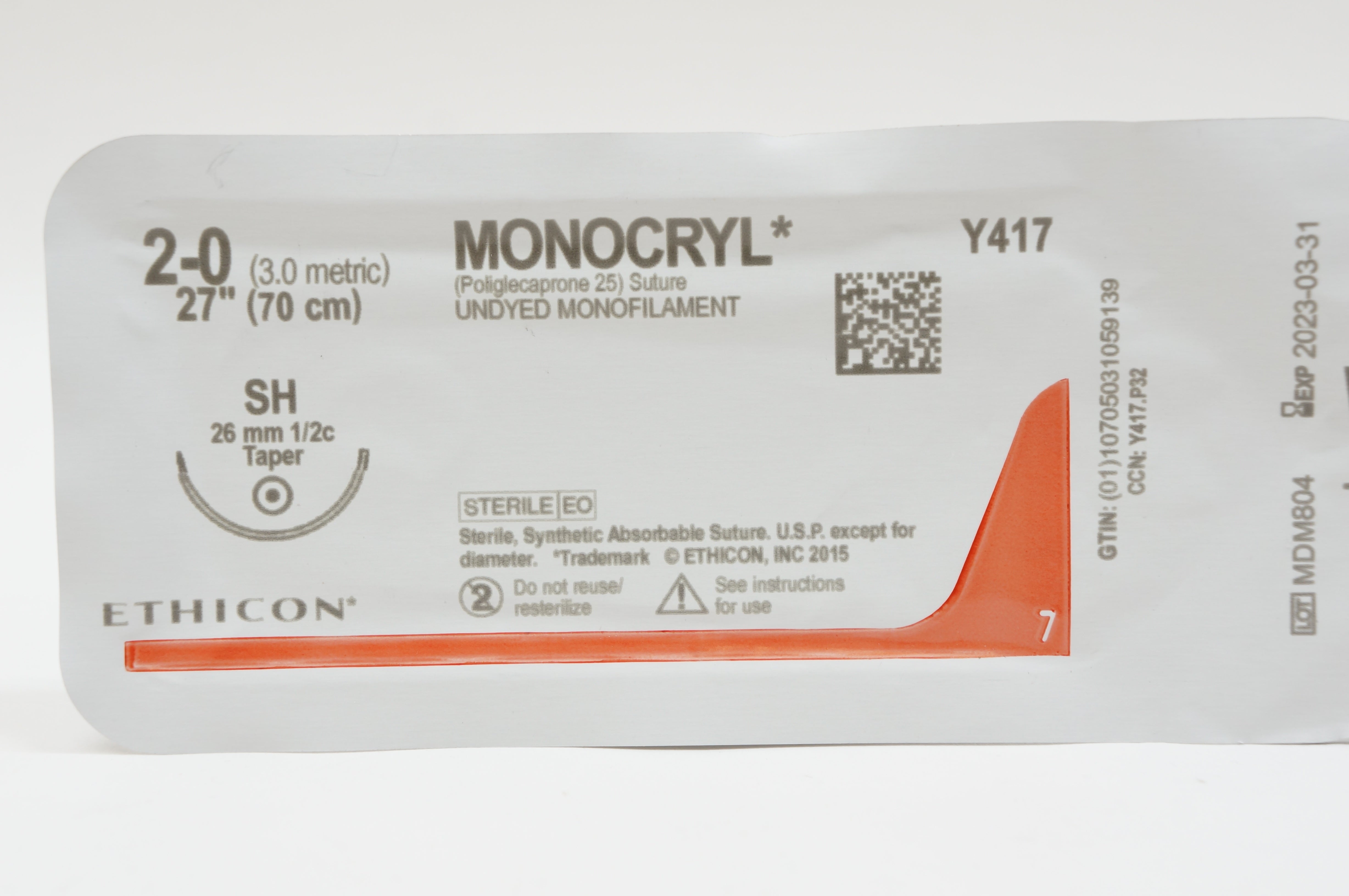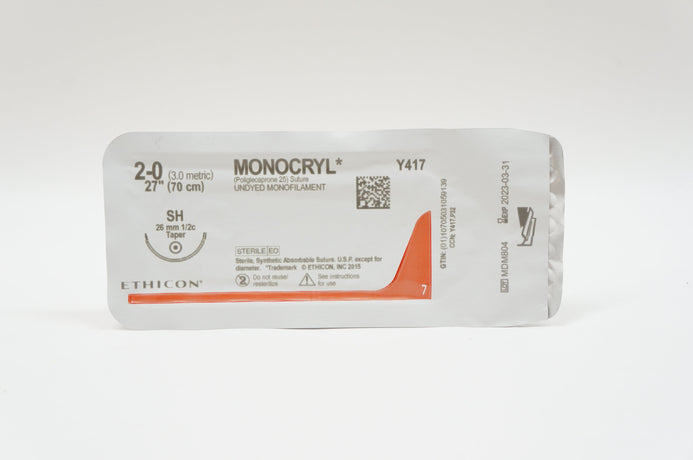 Ethicon Y417 2-0 MONOCRYL, SH, 26mm 1/2c Taper, 27inch