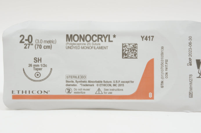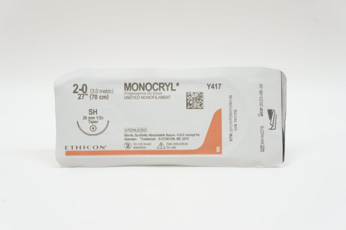 - Ethicon Y417 2-0 MONOCRYL, SH, 26mm1/2c Taper, 27inch