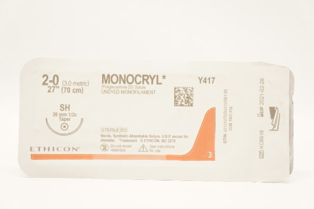 - Ethicon Y417H 2-0 MONOCRYL Stre SH 26mm 1/2c Taper 27inch