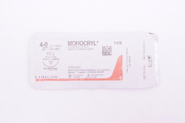 - Ethicon Y426 4-0 Monocryl Synthetic Stre PS-2 19mm 3/8c Reverse Cutting, 27 inch