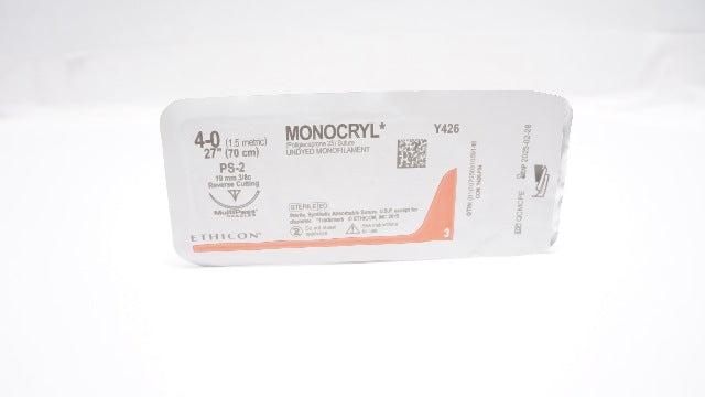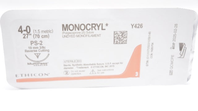 - Ethicon Y426 4-0 MONOCRYL Undyed Stre PS-2 19mm 3/8c Reverse Cutting, 27inch