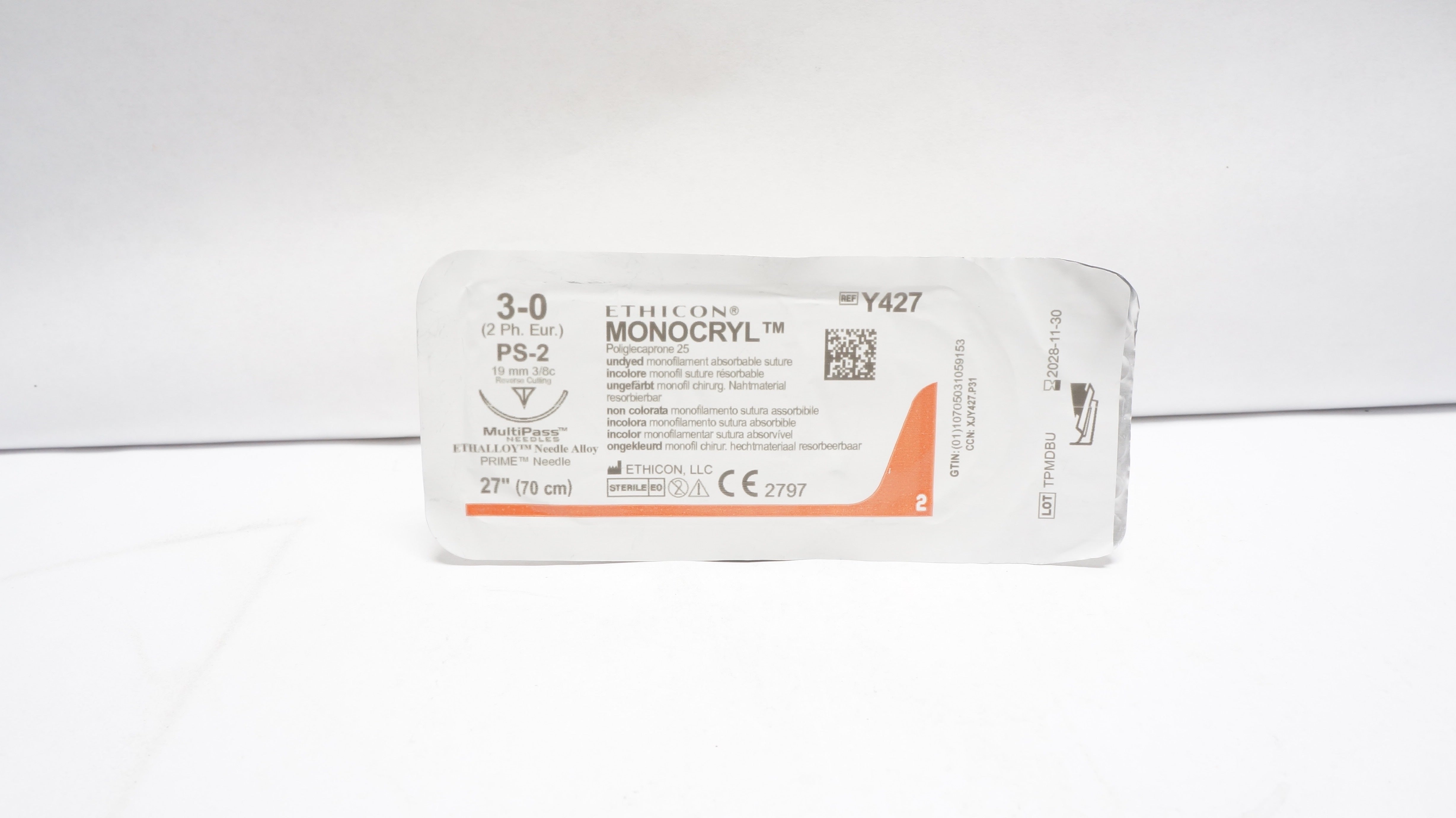 - Ethicon Y427 3-0 MONOCRYL Stre PS-2 19mm 3/8c Reverse Cutting, 27inch