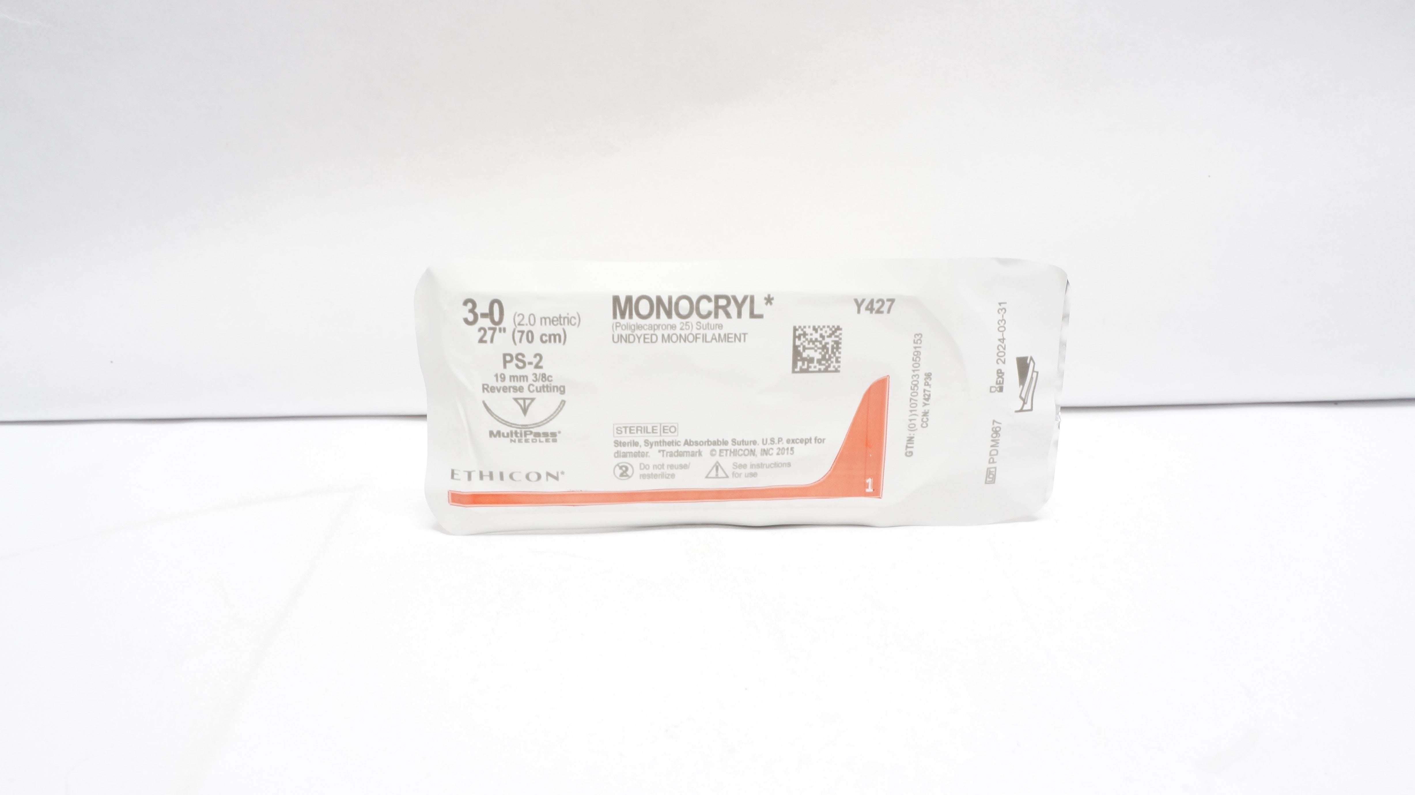 - Ethicon Y427 3-0 Monocryl Stre Undyed PS-2 19mm 3/8c Reverse Cutting, 27inch (x)