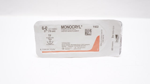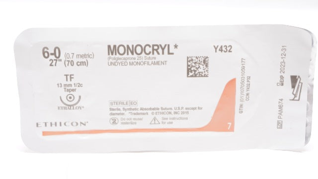 - Ethicon Y432 6-0 MONOCRYL Undyed Monofilament, TF, 13mm 1/2c Taper, 27inch (x)