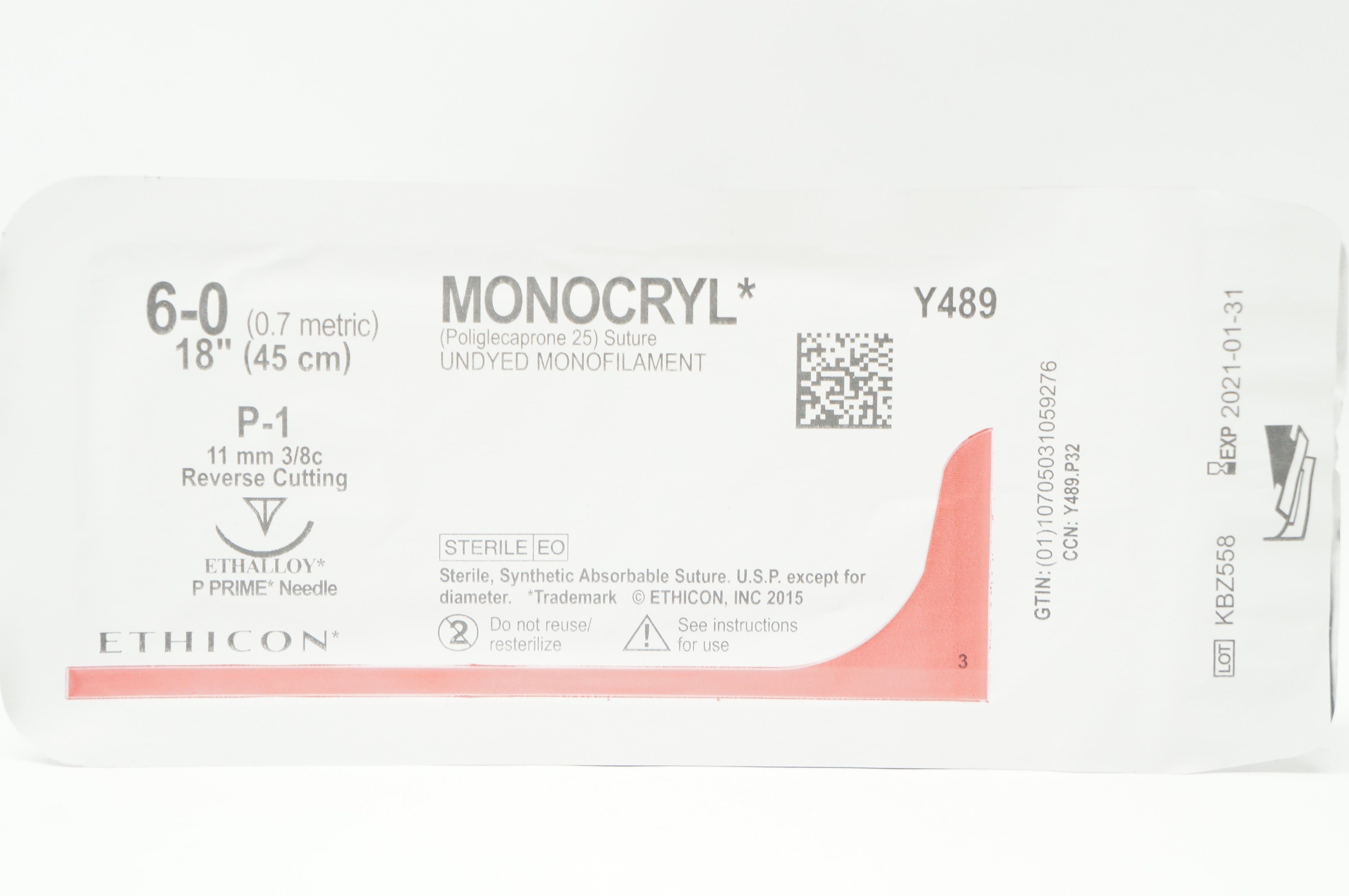 - Ethicon Y489 6-0 MONOCRYL, P-1, 11mm 3/8c Reverse Cutting, 18inch (x)