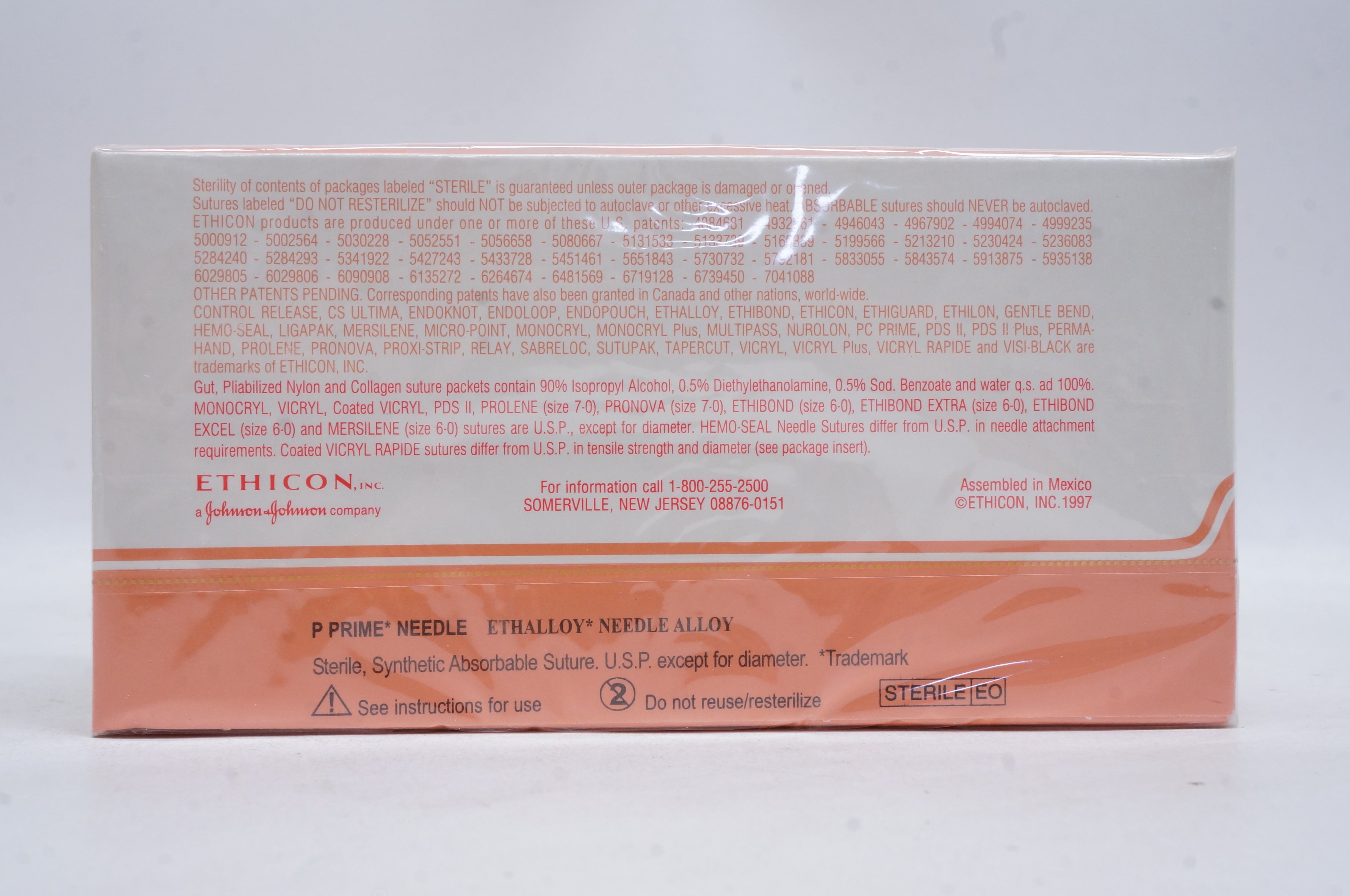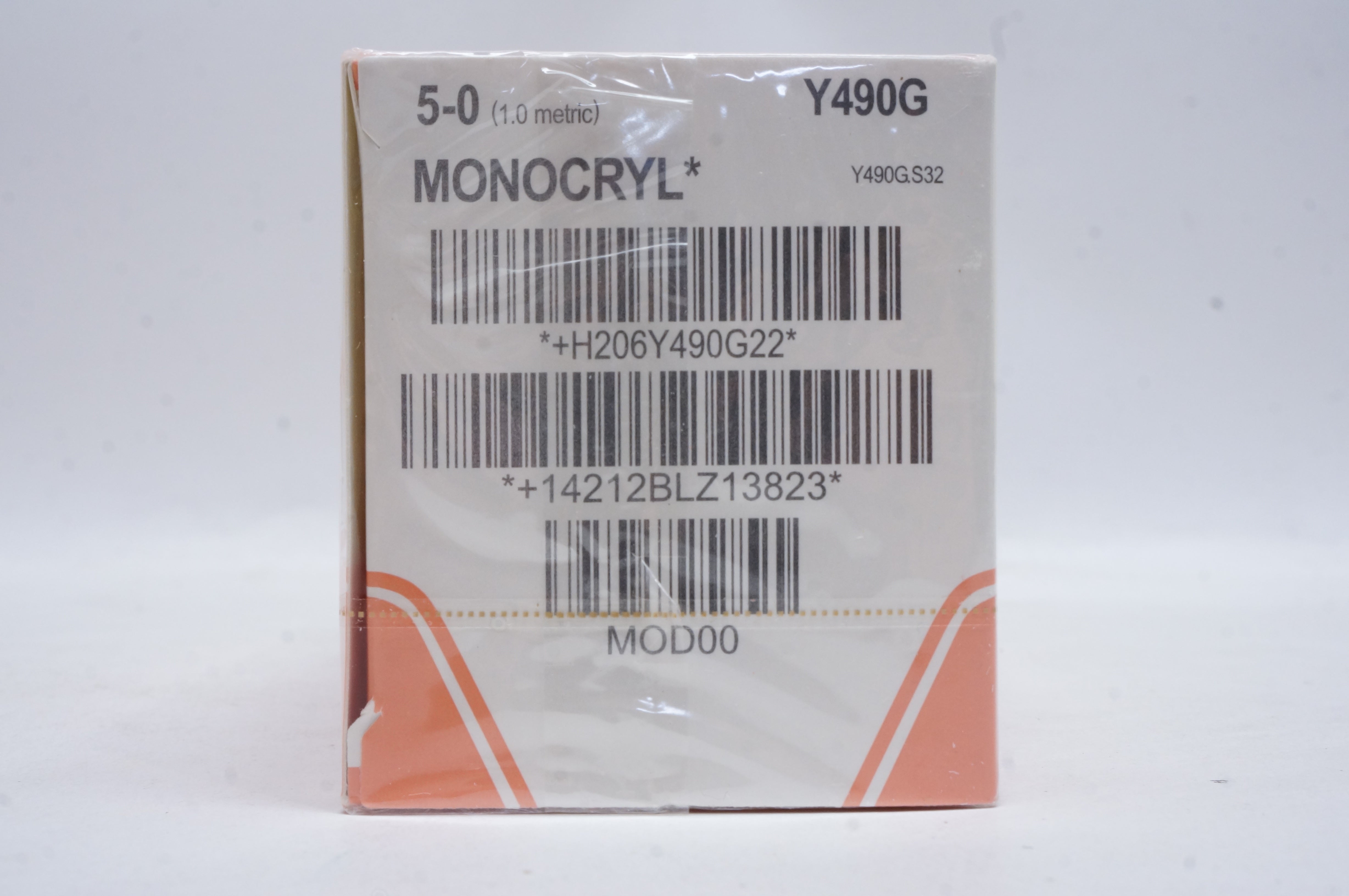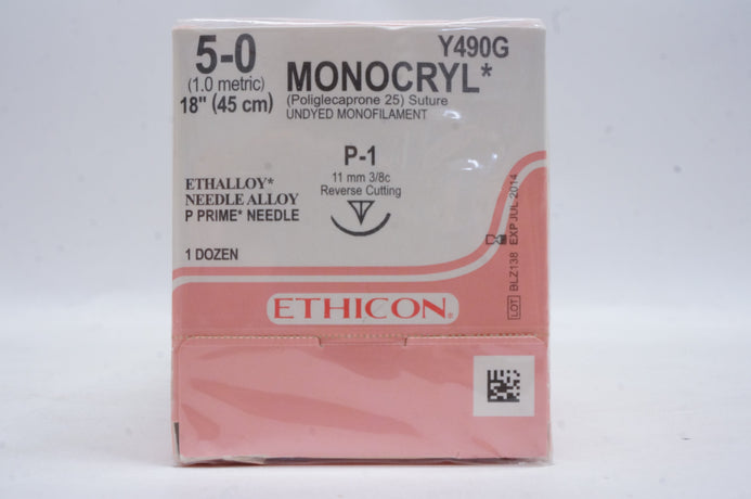 - Ethicon Y490G 5-0 MONOCRYL, P-1, 11mm 3/8c Reverse Cutting, 18inch (x)-Box of 12