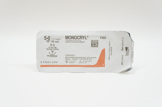 - Ethicon Y493 5-0 MONOCRYL, P-3, 13mm 3//8c Reverse Cutting, 18inch