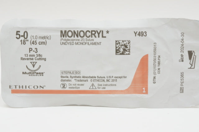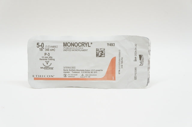 - Ethicon Y493 5-0 MONOCRYL Stre P-3, 13mm 3/8c Reverse Cutting, 18inch
