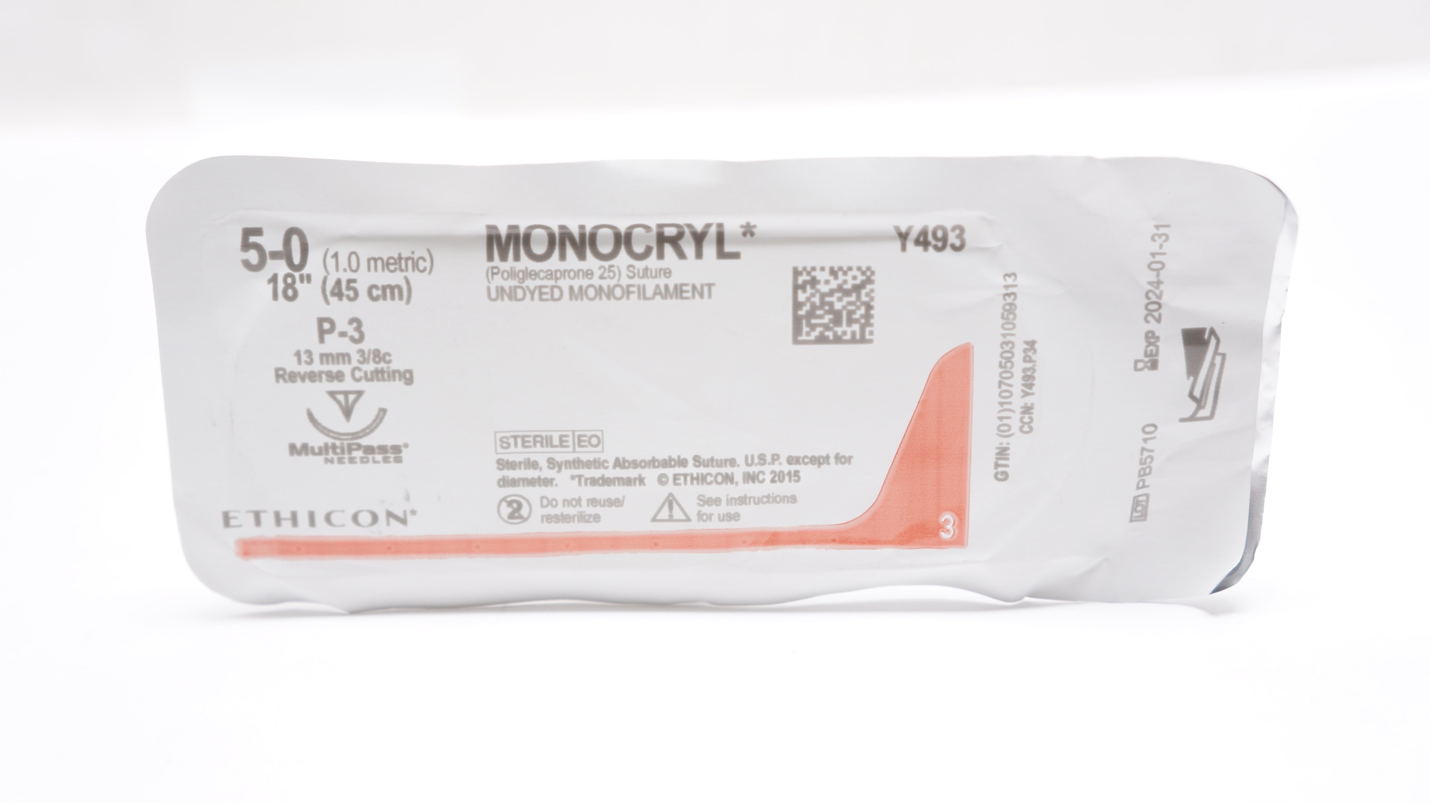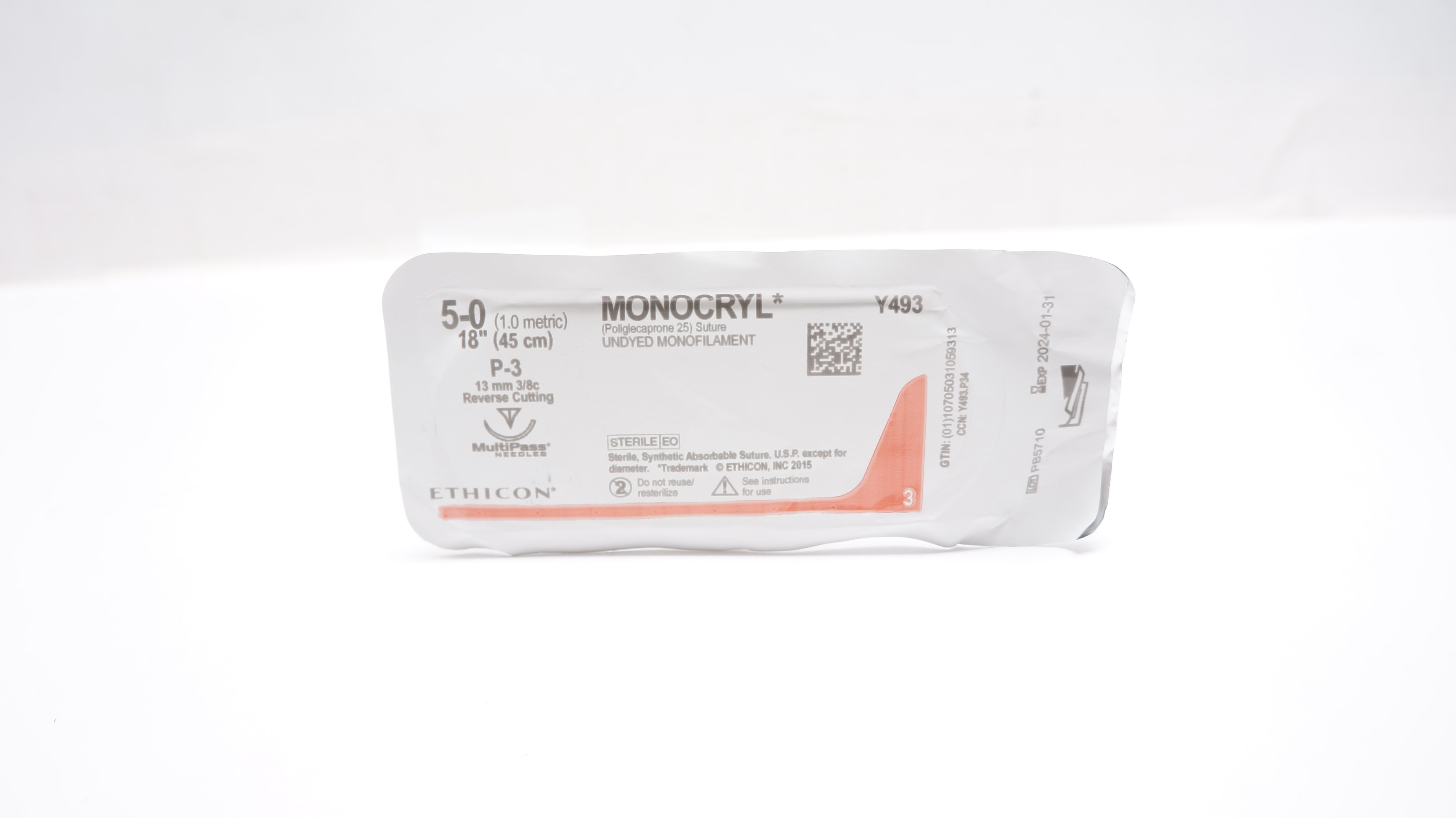 Ethicon Y493 5-0 MONOCRYL Stre Undyed P-3 13mm 3/8c Reverse Cutting, 18inch (x)