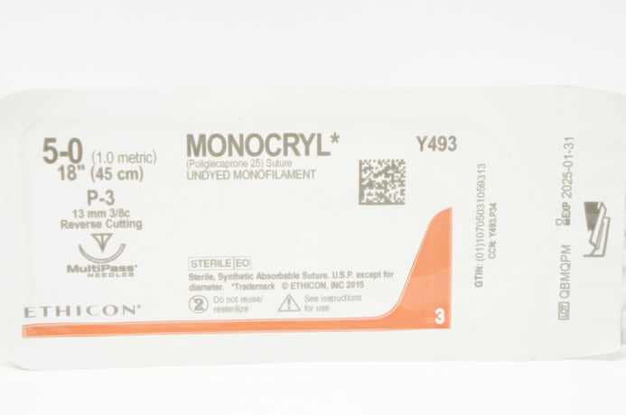 Ethicon Y493 5-0 MONOCRYL Undyed Monofilament P-3 13mm 3/8c Reverse Cutting,18in