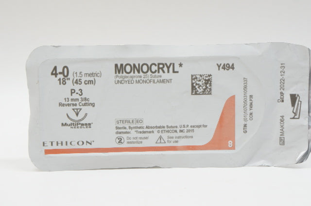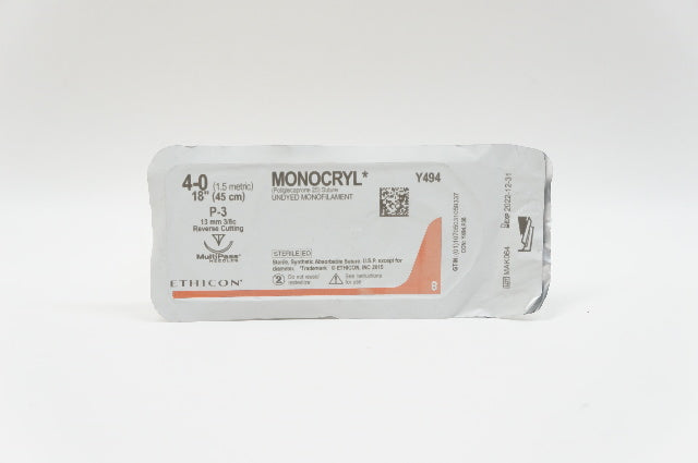- Ethicon Y494 4-0 MONOCRYL, P-3, 13mm 3/8c Reverse Cutting, 18inch