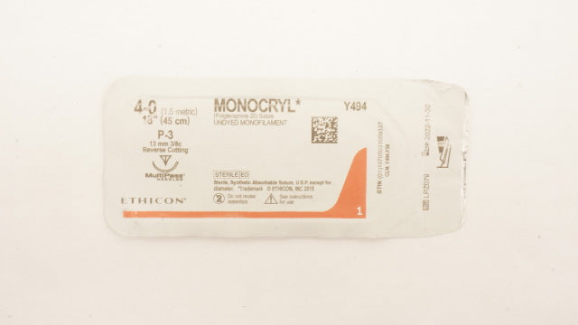 Ethicon Y494 4-0 MONOCRYL Poliglecapron Stre P-3 13mm 3/8c ReverseCutting 18inch